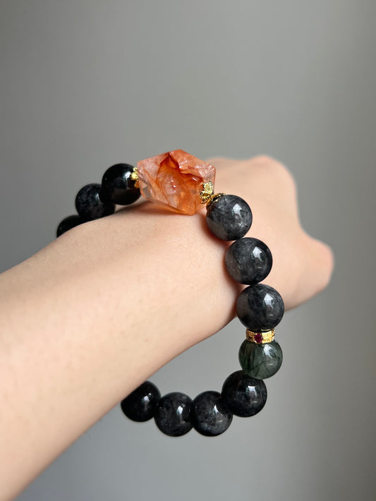 "cardinal's message" fire quartz x black & green rutilated quartz bracelet