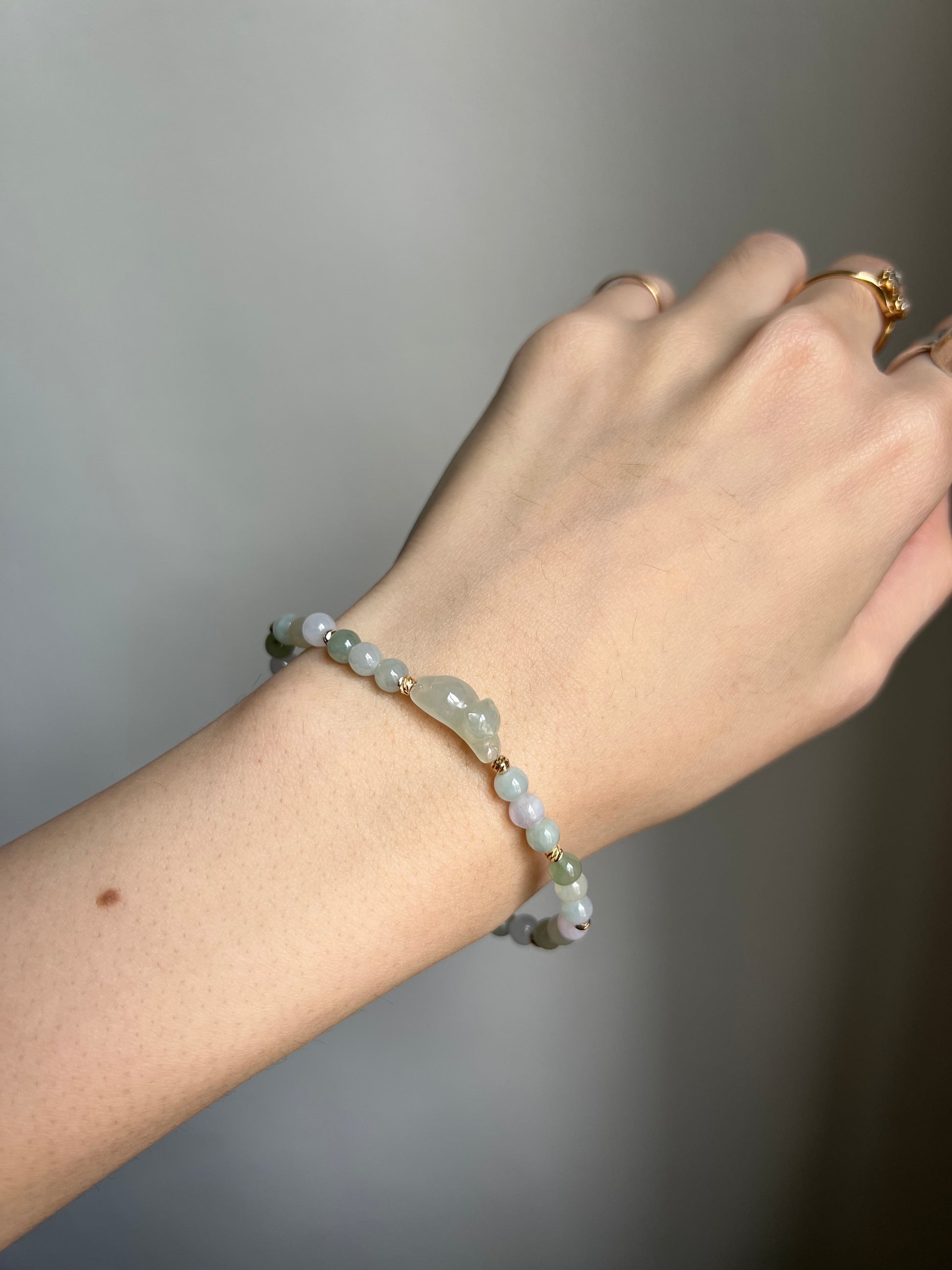 Icy green jadeite cat with mixed color jadeite beads. Only one available.